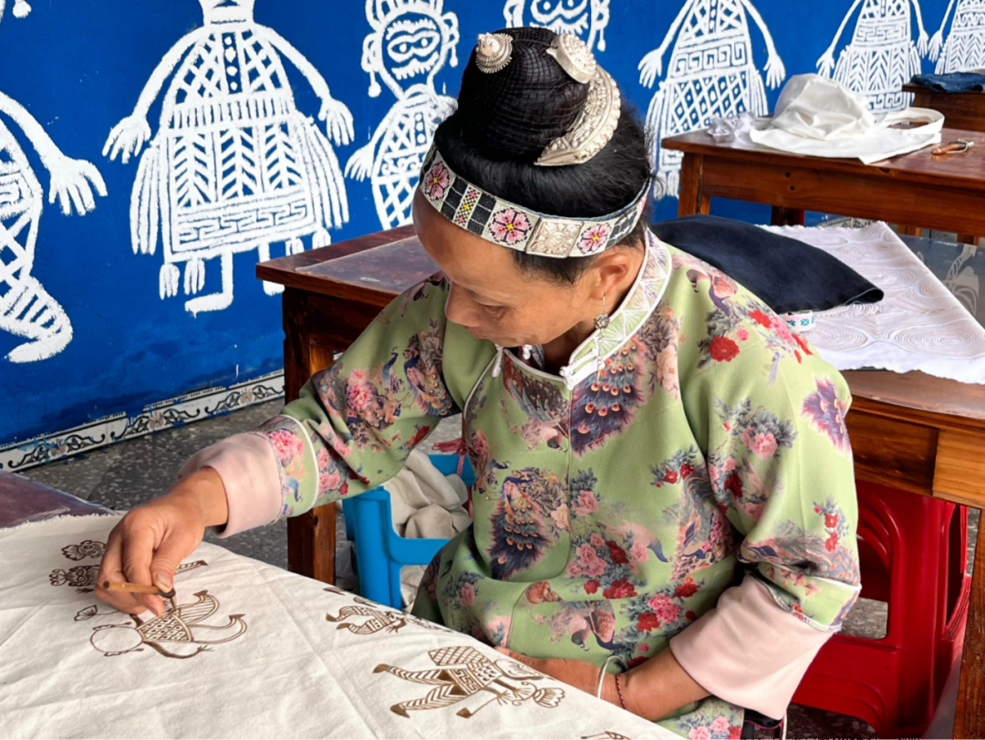 ▲苗寨里的蜡染画娘正在绘制苗族传统图腾中的人物纹。(受访者供图)