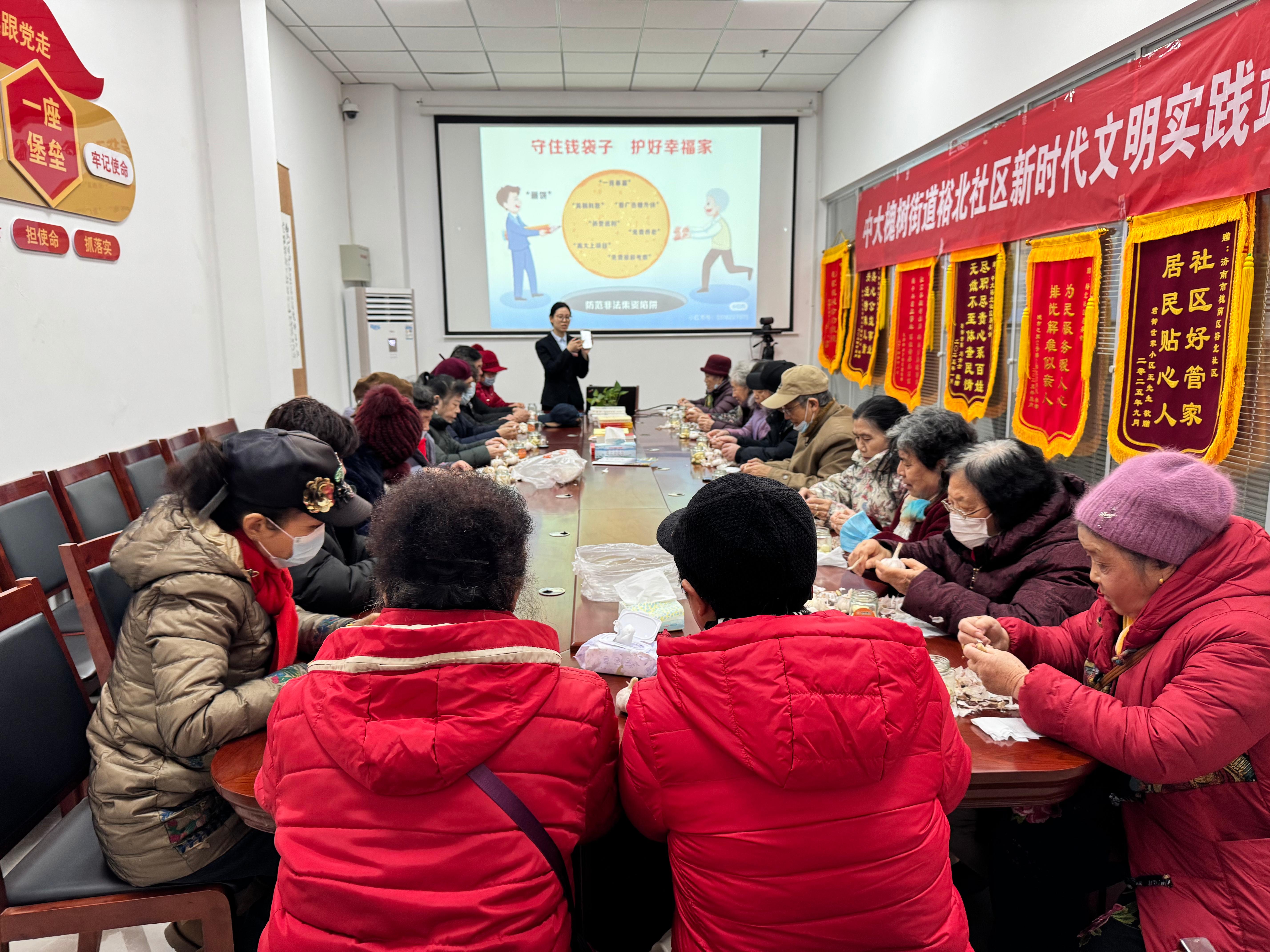 活动现场,支部党员为居民讲解腊八节的起源与传统习俗,从祭祀祈福的古老渊源,到喝腊八粥、腌腊八蒜的民俗传承。随后,带领居民沉浸式体验腌制腊八蒜的乐趣,手把手指导蒜瓣处理、醋汁调配等操作,同时将精心准备的腊八粥逐一分送到居民手中,一碗碗热粥暖心暖胃。在民俗体验之余,支部党员立足居民金融需求,围绕防范非法金融活动、养老金融等内容展开详细讲解,为居民普及金融知识、筑牢反诈防线,专业的讲解和贴心的提示获得居民一致认可,活动现场反响热烈。
